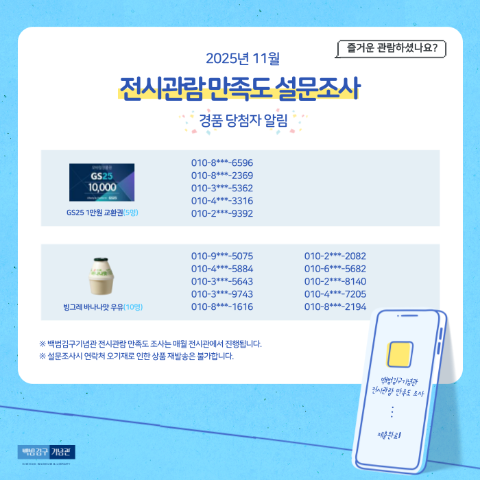 ![]() ¹é¹ü±è±¸±â³ä°ü¿¡¼´Â Àü½Ã¸¦ °ü¶÷ÇÑ °ü¶÷°´À» ´ë»óÀ¸·Î Àü½Ã°ü¶÷ ¸¸Á·µµ ¼³¹®Á¶»ç¸¦ ÁøÇàÇϰí ÀÖ½À´Ï´Ù. ¸Å¿ù ¼³¹®¿¡ ÀÀÇØÁֽŠºÐµé Áß Ãß÷À» ÅëÇØ ±âÇÁƼÄÜÀ» ¹ß¼ÛÇØµå¸®°í ÀÖ½À´Ï´Ù. 11¿ùÀÇ °æÇ° ´ç÷ÀÚ¸¦ ¾Ë·Áµå¸³´Ï´Ù. (12/2 ±âÇÁƼÄÜ ¹ß¼Û ¿¹Á¤) ÇÑ´Þ°£ ±â³ä°üÀ» ã¾ÆÁֽаü¶÷°´µé²² °¨»çµå¸®¸ç, º¸³»ÁֽмÒÁßÇÑ ÀǰßÀº È®ÀÎ ÈÄ ¹Ý¿µÇϰí ÀÖ½À´Ï´Ù. ¾ÕÀ¸·Îµµ °ü¶÷°´ Àǰ߿¡ ±Í±â¿ïÀÌ´Â ±â³ä°üÀÌ µÇ°Ú½À´Ï´Ù. - ¹é¹ü±è±¸±â³ä°ü KIMKOO MUSEUM & LIBRARY -
