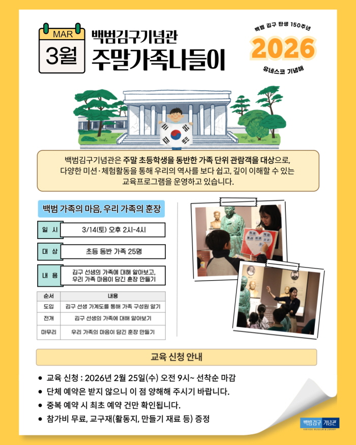 [±³À° ½Åû Àü ²À! ÀоîÁÖ¼¼¿ä] - ÃÊµî ´ë»ó ±³À°(Çкθ𠵿¹Ý ±³À°)ÀÔ´Ï´Ù. - ±³À° ½Åû ±â°£Àº 2/25(¼ö) ¿ÀÀü 9½ÃºÎÅÍ ¼±Âø¼ø ¸¶°¨µË´Ï´Ù. - Âü¿©°¡Á·µéÀº ÇÁ·Î±×·¥ ½Ã°£ 10ºÐÀü±îÁö ±â³ä°ü ¾È³»º¸Á¶µ¥½ºÅ©¿¡ µµÂøÇØÁֽñ⠹ٶø´Ï´Ù. - ¿¹¾à½Ã, ±³À°¿¡ Âü¿©ÇÏ´Â ¾î¸°ÀÌ ¸íÂû Á¦ÀÛÀ» À§ÇØ Âü¿©ÇÏ´Â ¾î¸°ÀÌ À̸§À» Àû¾îÁÖ¼¼¿ä. - ¢Ï ¹®ÀÇ»çÇ× : 02-799-3434 ¡Ø ºñȸ¿ø ¿¹¾à °¡´É(ȸ¿ø°¡ÀÔ ±â´É ¾øÀ½)